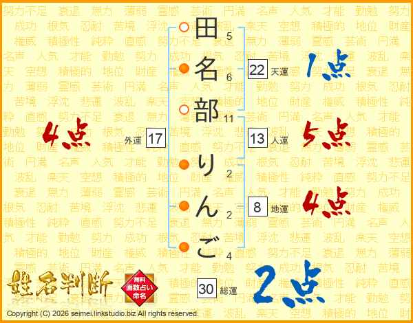 田(5画)名(6画)部(11画) り(2画)ん(2画)ご(4画)