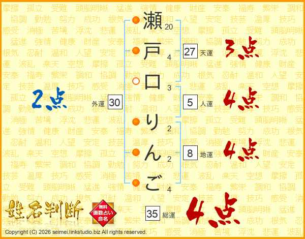 瀬(20画)戸(4画)口(3画) り(2画)ん(2画)ご(4画)