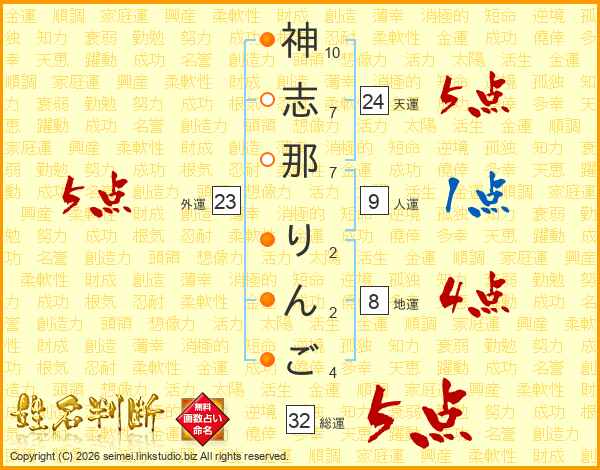 神(10画)志(7画)那(7画) り(2画)ん(2画)ご(4画)