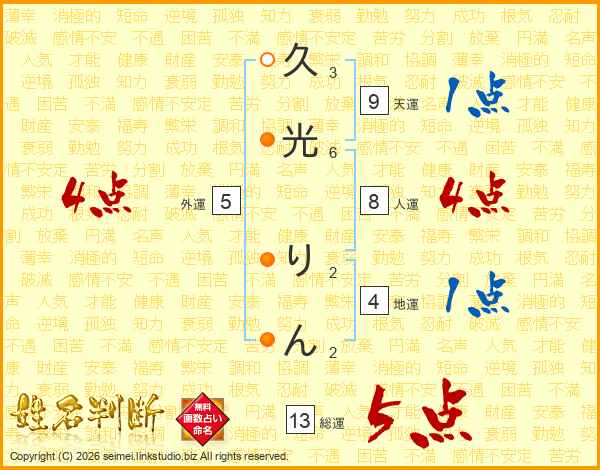 生活面を象徴する運勢です。外部から受ける影響力を表し、結婚運、家庭運や職場、環境への順応性を表します。総運から人運を引いた画数。姓や名が1文字の場合を除く。