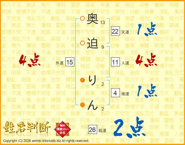 生活面を象徴する運勢です。外部から受ける影響力を表し、結婚運、家庭運や職場、環境への順応性を表します。総運から人運を引いた画数。姓や名が1文字の場合を除く。