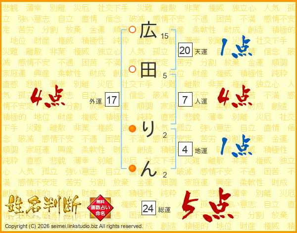生活面を象徴する運勢です。外部から受ける影響力を表し、結婚運、家庭運や職場、環境への順応性を表します。総運から人運を引いた画数。姓や名が1文字の場合を除く。