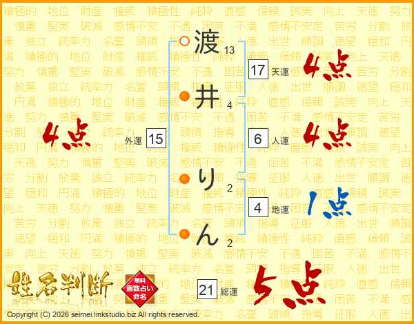 渡井りんさんの総運は21画の5点!