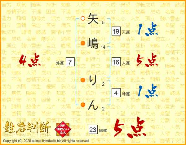 矢(5画)嶋(14画) り(2画)ん(2画)