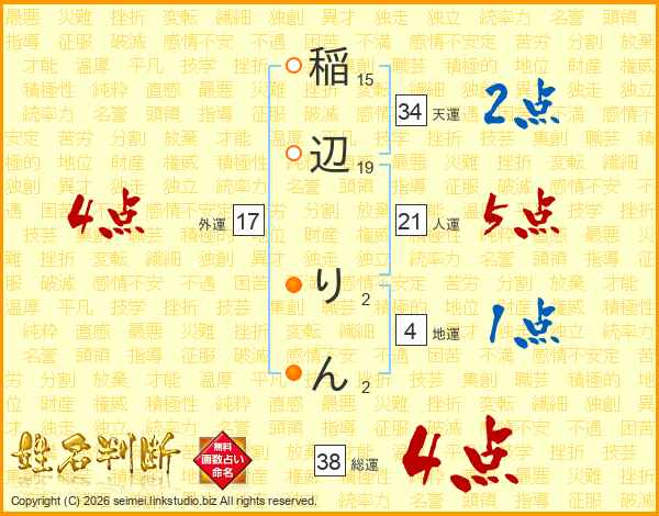 生活面を象徴する運勢です。外部から受ける影響力を表し、結婚運、家庭運や職場、環境への順応性を表します。総運から人運を引いた画数。姓や名が1文字の場合を除く。