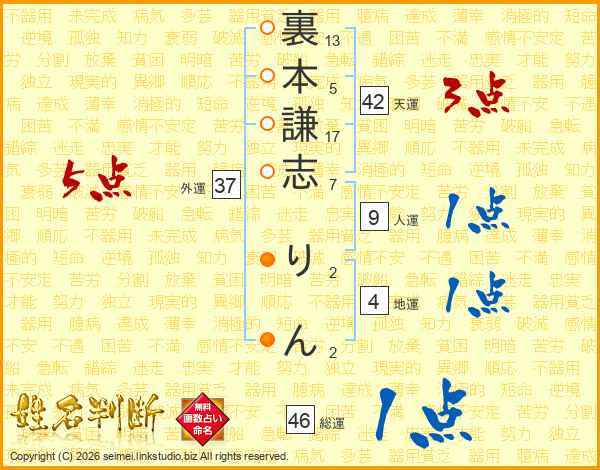 裏(13画)本(5画)謙(17画)志(7画) り(2画)ん(2画)