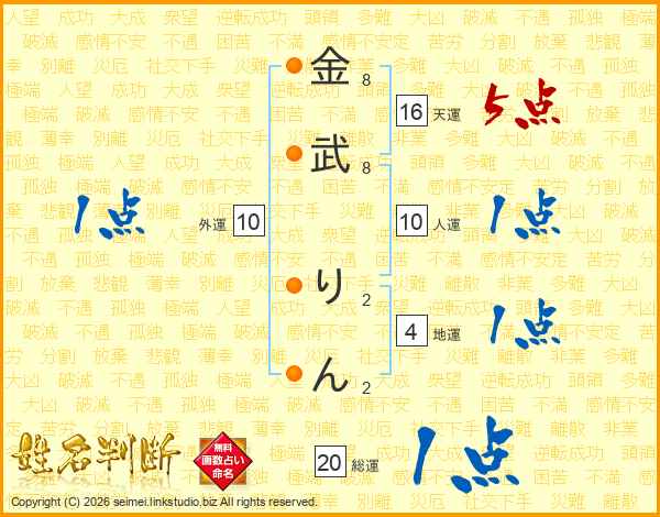 生活面を象徴する運勢です。外部から受ける影響力を表し、結婚運、家庭運や職場、環境への順応性を表します。総運から人運を引いた画数。姓や名が1文字の場合を除く。
