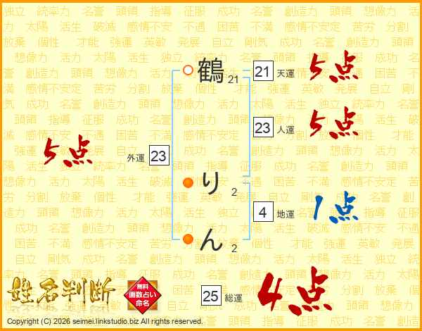 生活面を象徴する運勢です。外部から受ける影響力を表し、結婚運、家庭運や職場、環境への順応性を表します。総運から人運を引いた画数。姓や名が1文字の場合を除く。