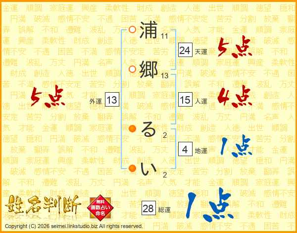 生活面を象徴する運勢です。外部から受ける影響力を表し、結婚運、家庭運や職場、環境への順応性を表します。総運から人運を引いた画数。姓や名が1文字の場合を除く。