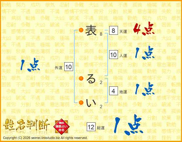 生活面を象徴する運勢です。外部から受ける影響力を表し、結婚運、家庭運や職場、環境への順応性を表します。総運から人運を引いた画数。姓や名が1文字の場合を除く。