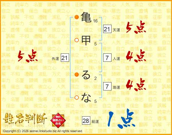 生活面を象徴する運勢です。外部から受ける影響力を表し、結婚運、家庭運や職場、環境への順応性を表します。総運から人運を引いた画数。姓や名が1文字の場合を除く。