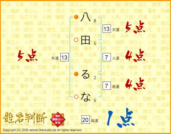 生活面を象徴する運勢です。外部から受ける影響力を表し、結婚運、家庭運や職場、環境への順応性を表します。総運から人運を引いた画数。姓や名が1文字の場合を除く。