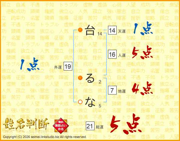 台るなさんの総運は21画の5点!