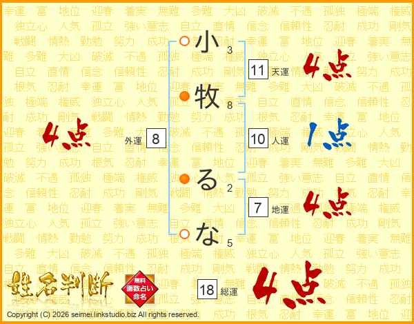 生活面を象徴する運勢です。外部から受ける影響力を表し、結婚運、家庭運や職場、環境への順応性を表します。総運から人運を引いた画数。姓や名が1文字の場合を除く。