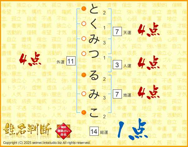 生活面を象徴する運勢です。外部から受ける影響力を表し、結婚運、家庭運や職場、環境への順応性を表します。総運から人運を引いた画数。姓や名が1文字の場合を除く。