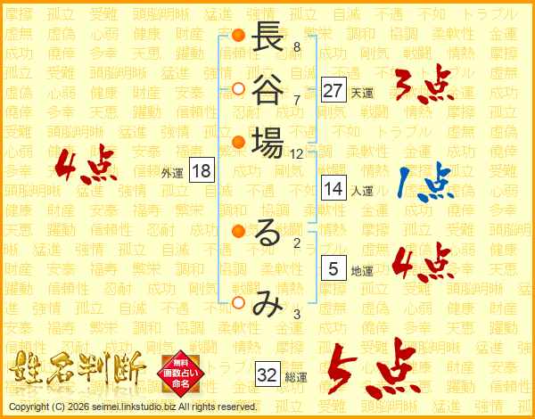 生活面を象徴する運勢です。外部から受ける影響力を表し、結婚運、家庭運や職場、環境への順応性を表します。総運から人運を引いた画数。姓や名が1文字の場合を除く。