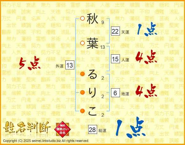秋(9画)葉(13画) る(2画)り(2画)こ(2画)