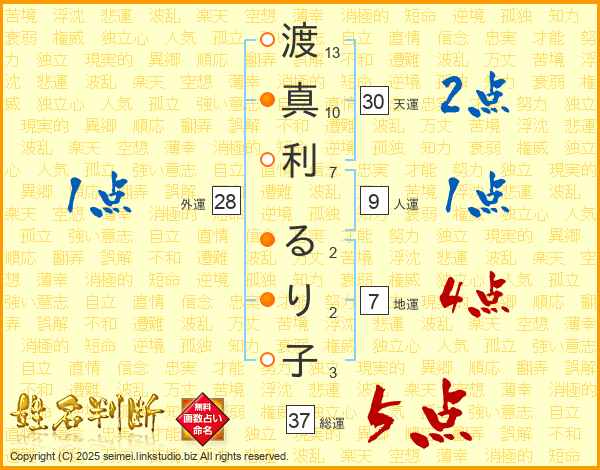 渡真利るり子さんの総運は37画の5点!