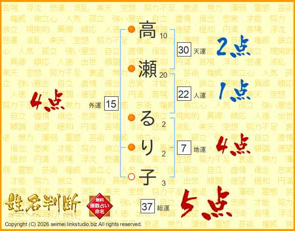 高(10画)瀬(20画) る(2画)り(2画)子(3画)