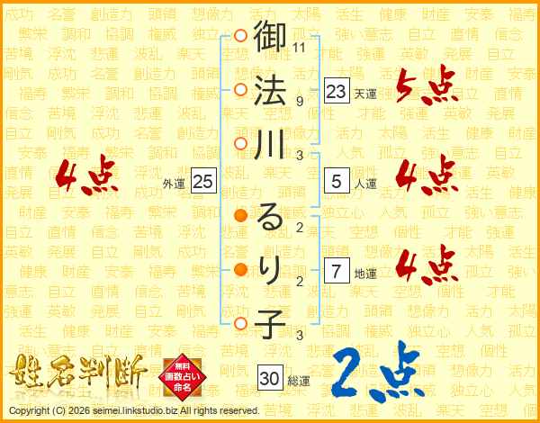 御(11画)法(9画)川(3画) る(2画)り(2画)子(3画)