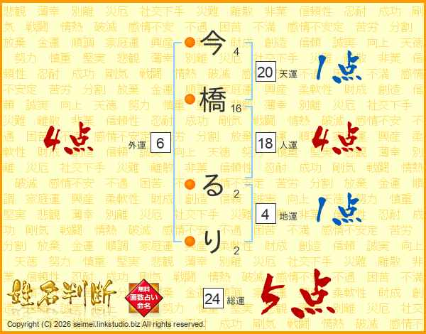 生活面を象徴する運勢です。外部から受ける影響力を表し、結婚運、家庭運や職場、環境への順応性を表します。総運から人運を引いた画数。姓や名が1文字の場合を除く。