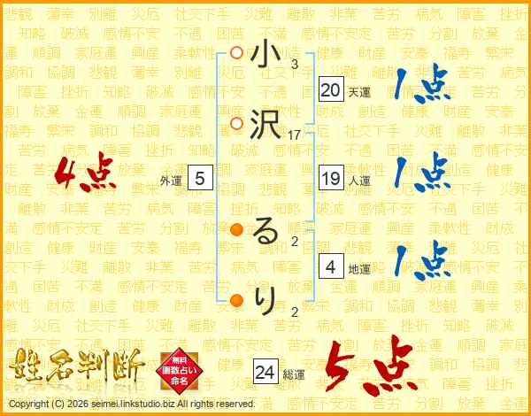 生活面を象徴する運勢です。外部から受ける影響力を表し、結婚運、家庭運や職場、環境への順応性を表します。総運から人運を引いた画数。姓や名が1文字の場合を除く。