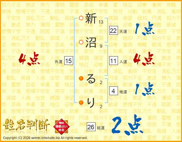 生活面を象徴する運勢です。外部から受ける影響力を表し、結婚運、家庭運や職場、環境への順応性を表します。総運から人運を引いた画数。姓や名が1文字の場合を除く。