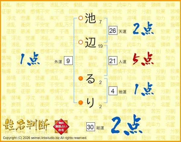 生活面を象徴する運勢です。外部から受ける影響力を表し、結婚運、家庭運や職場、環境への順応性を表します。総運から人運を引いた画数。姓や名が1文字の場合を除く。