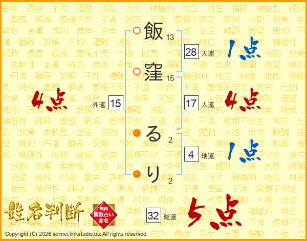生活面を象徴する運勢です。外部から受ける影響力を表し、結婚運、家庭運や職場、環境への順応性を表します。総運から人運を引いた画数。姓や名が1文字の場合を除く。