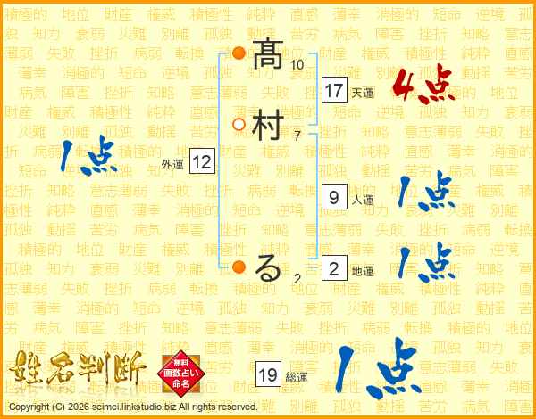 生活面を象徴する運勢です。外部から受ける影響力を表し、結婚運、家庭運や職場、環境への順応性を表します。総運から人運を引いた画数。姓や名が1文字の場合を除く。