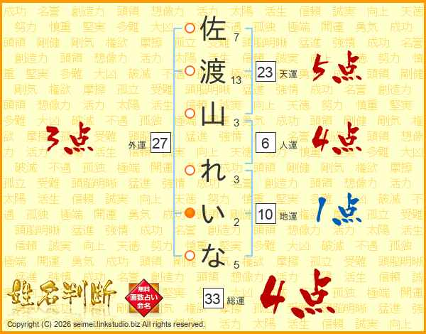 佐(7画)渡(13画)山(3画) れ(3画)い(2画)な(5画)
