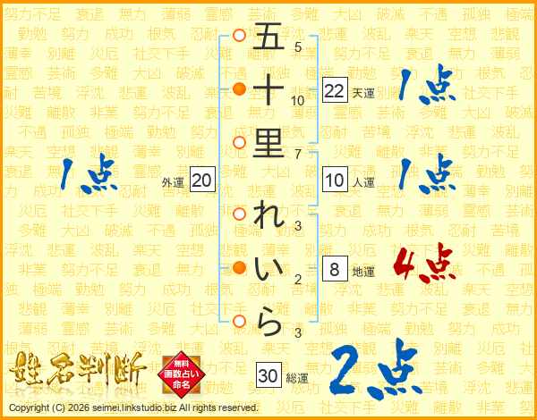 生活面を象徴する運勢です。外部から受ける影響力を表し、結婚運、家庭運や職場、環境への順応性を表します。総運から人運を引いた画数。姓や名が1文字の場合を除く。