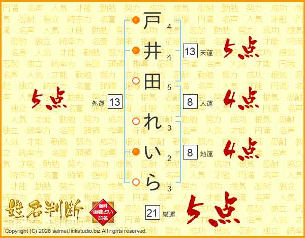 戸井田れいらさんの天運は13画の5点!