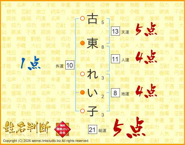 古東れい子さんの総運は21画の5点!