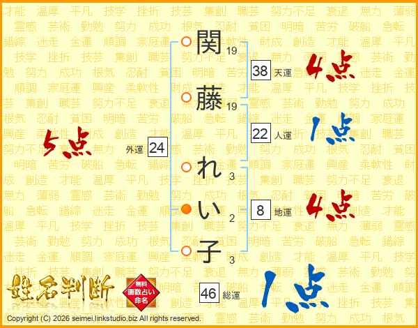 関(19画)藤(19画) れ(3画)い(2画)子(3画)