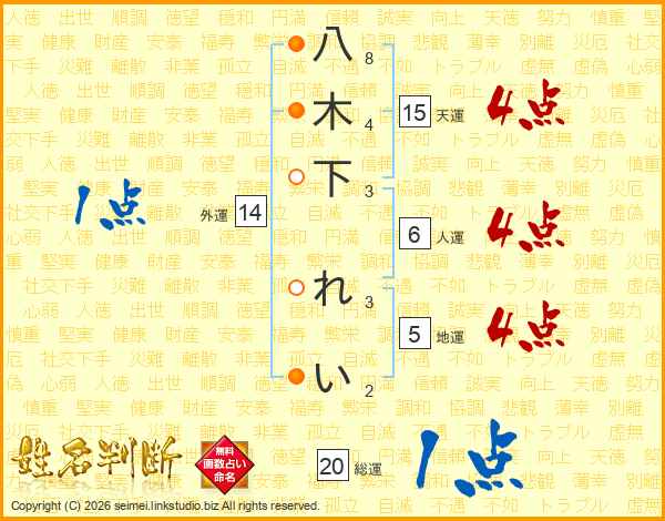 生活面を象徴する運勢です。外部から受ける影響力を表し、結婚運、家庭運や職場、環境への順応性を表します。総運から人運を引いた画数。姓や名が1文字の場合を除く。