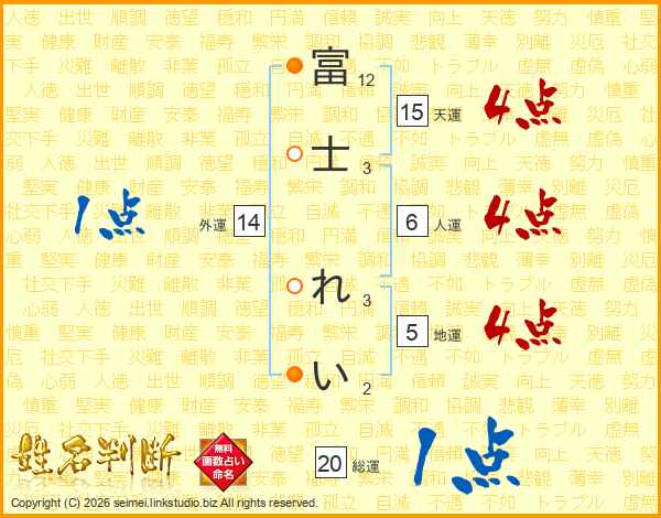 生活面を象徴する運勢です。外部から受ける影響力を表し、結婚運、家庭運や職場、環境への順応性を表します。総運から人運を引いた画数。姓や名が1文字の場合を除く。