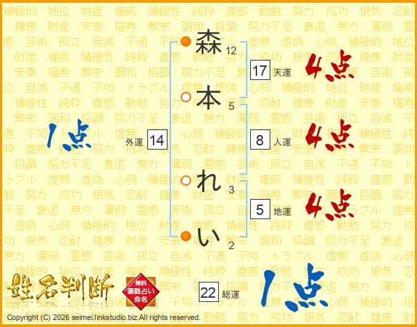 森本れいさんの総運は22画の1点!