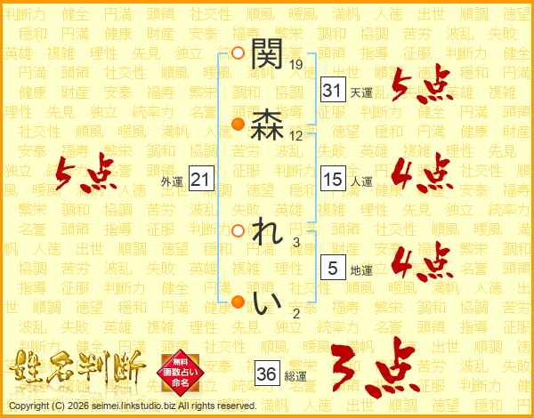 生活面を象徴する運勢です。外部から受ける影響力を表し、結婚運、家庭運や職場、環境への順応性を表します。総運から人運を引いた画数。姓や名が1文字の場合を除く。