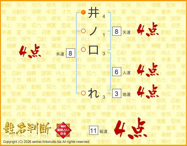 生活面を象徴する運勢です。外部から受ける影響力を表し、結婚運、家庭運や職場、環境への順応性を表します。総運から人運を引いた画数。姓や名が1文字の場合を除く。