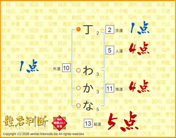 生活面を象徴する運勢です。外部から受ける影響力を表し、結婚運、家庭運や職場、環境への順応性を表します。総運から人運を引いた画数。姓や名が1文字の場合を除く。