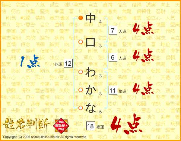 中(4画)口(3画) わ(3画)か(3画)な(5画)