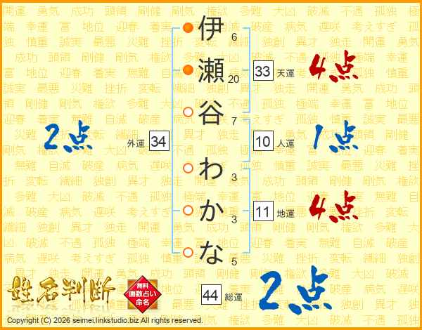 伊(6画)瀬(20画)谷(7画) わ(3画)か(3画)な(5画)