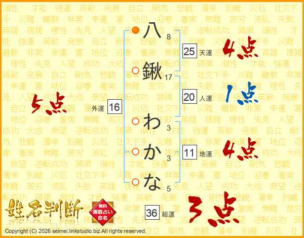 八(8画)鍬(17画) わ(3画)か(3画)な(5画)
