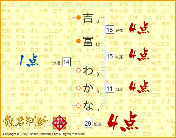 吉(6画)富(12画) わ(3画)か(3画)な(5画)