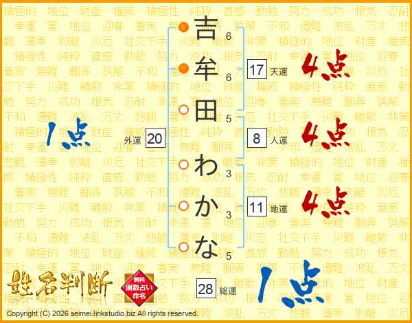 吉(6画)牟(6画)田(5画) わ(3画)か(3画)な(5画)