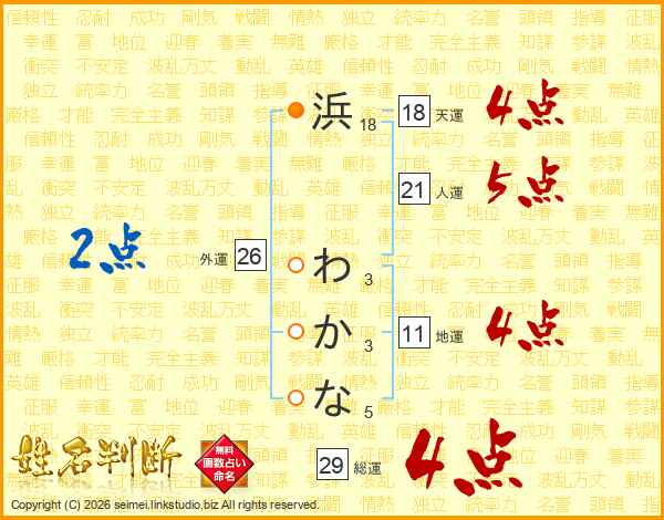 生活面を象徴する運勢です。外部から受ける影響力を表し、結婚運、家庭運や職場、環境への順応性を表します。総運から人運を引いた画数。姓や名が1文字の場合を除く。