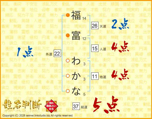 福(14画)富(12画) わ(3画)か(3画)な(5画)
