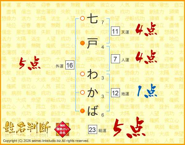 七(7画)戸(4画) わ(3画)か(3画)ば(6画)