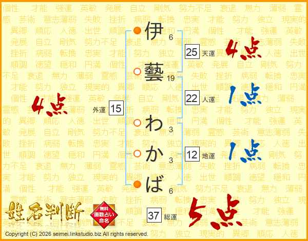 伊(6画)藝(19画) わ(3画)か(3画)ば(6画)